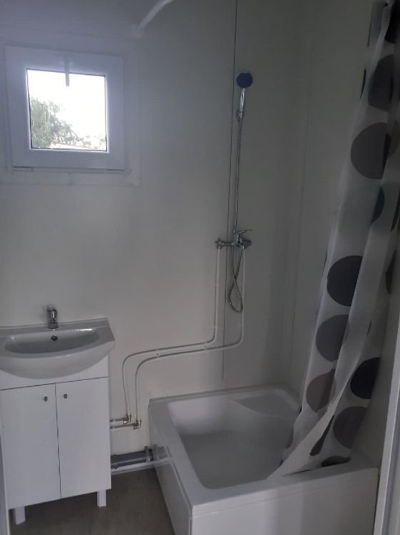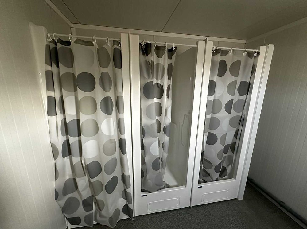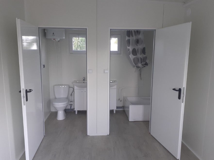 Bloc complet avec WC, douches et lavabos. Sol antidérapant et parois lavables haute densité.